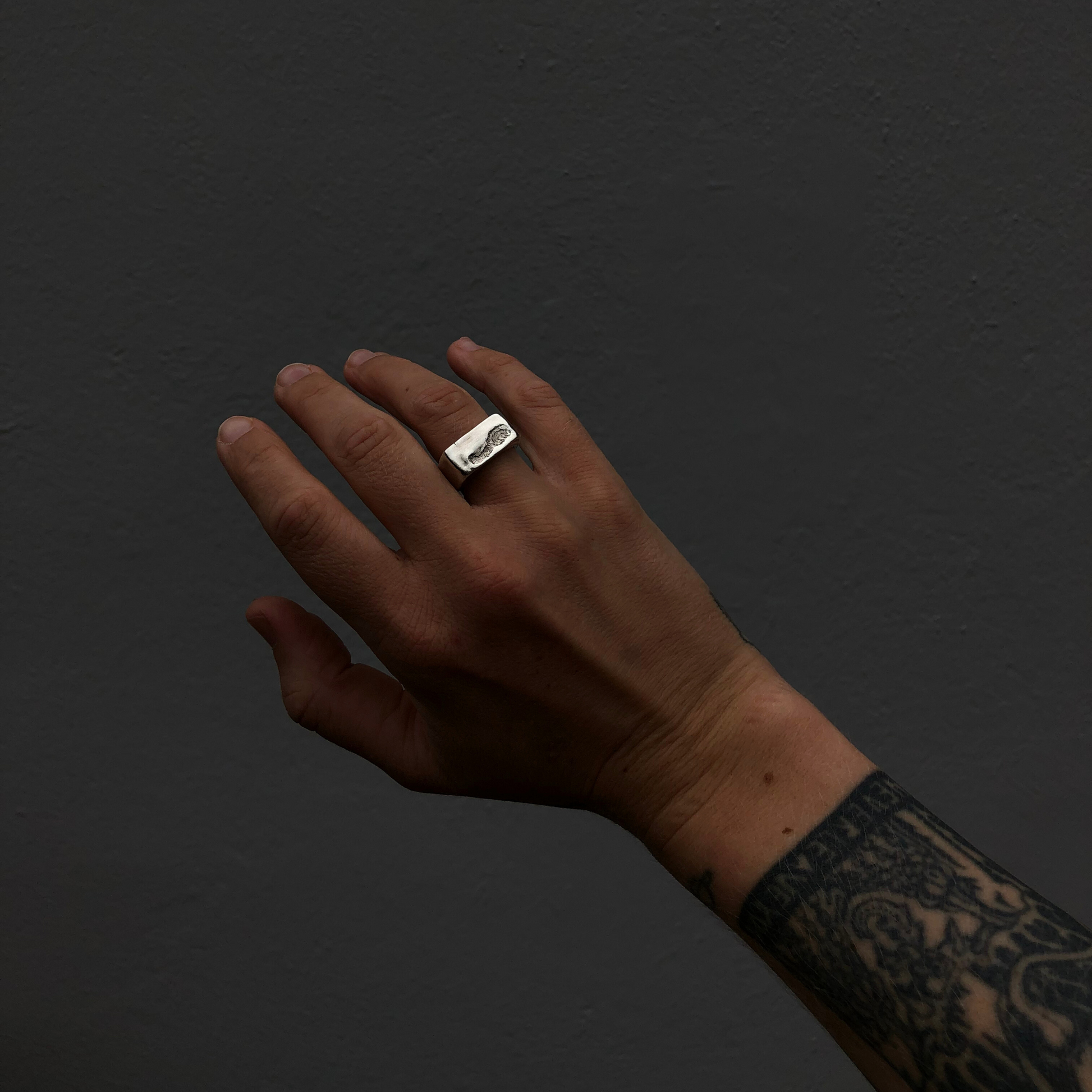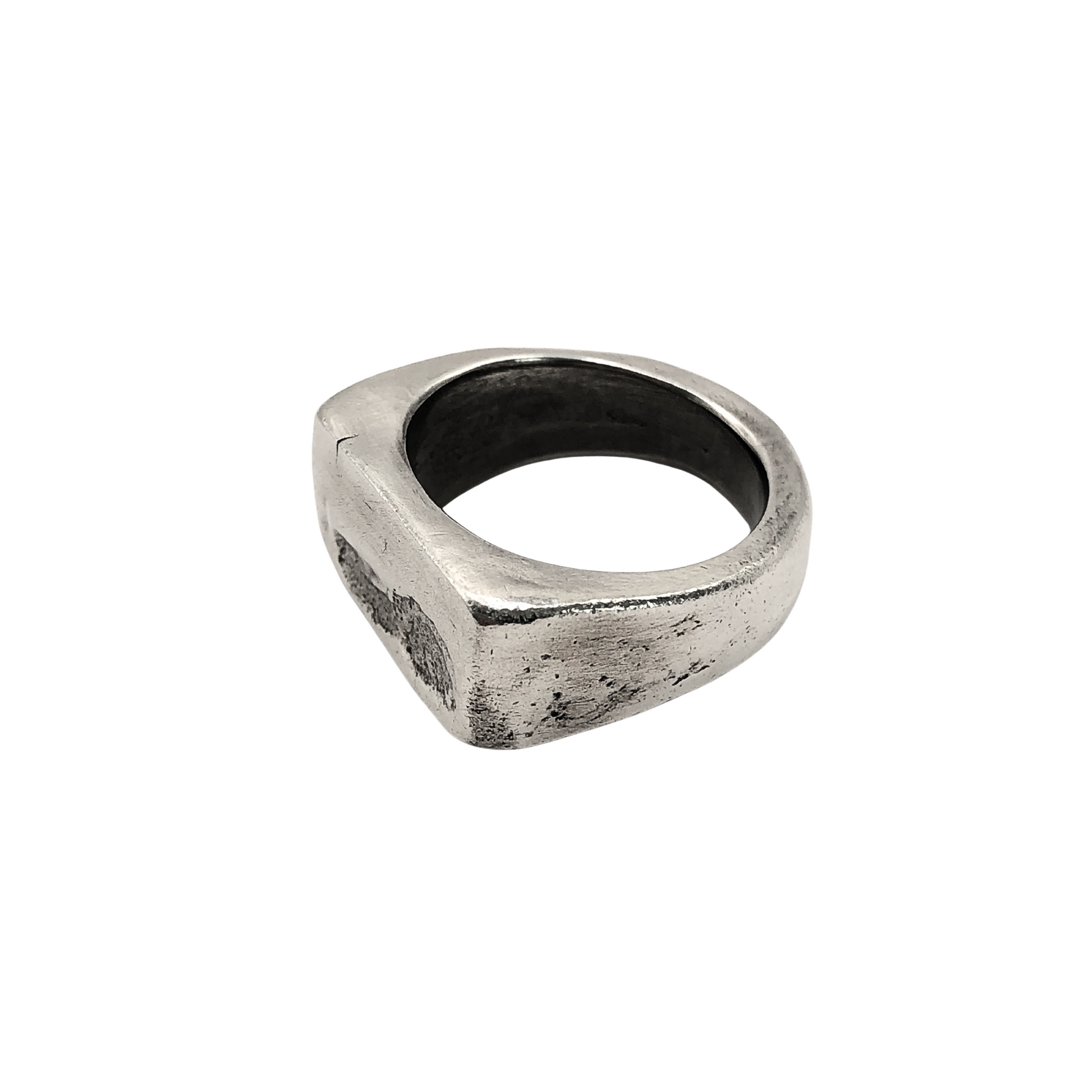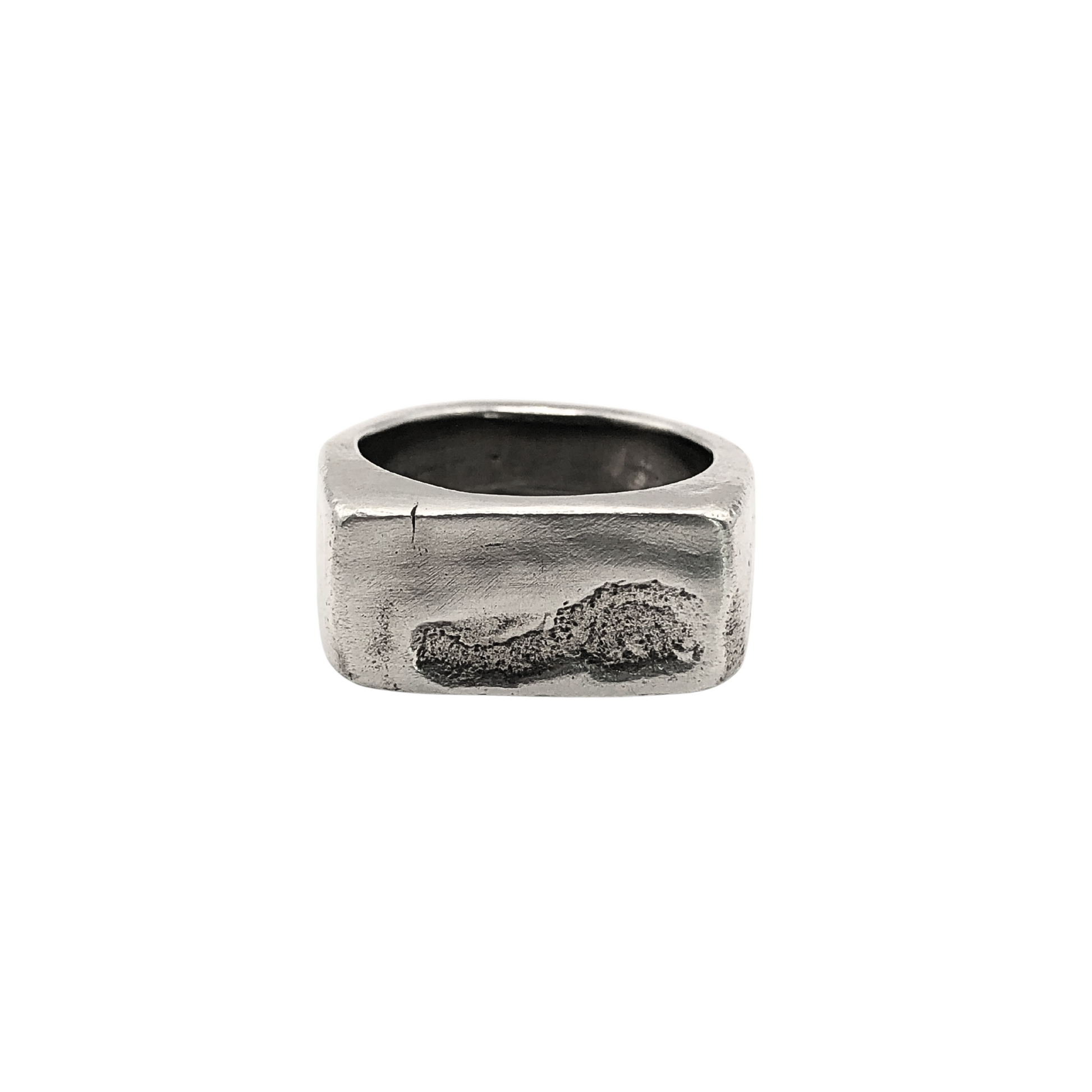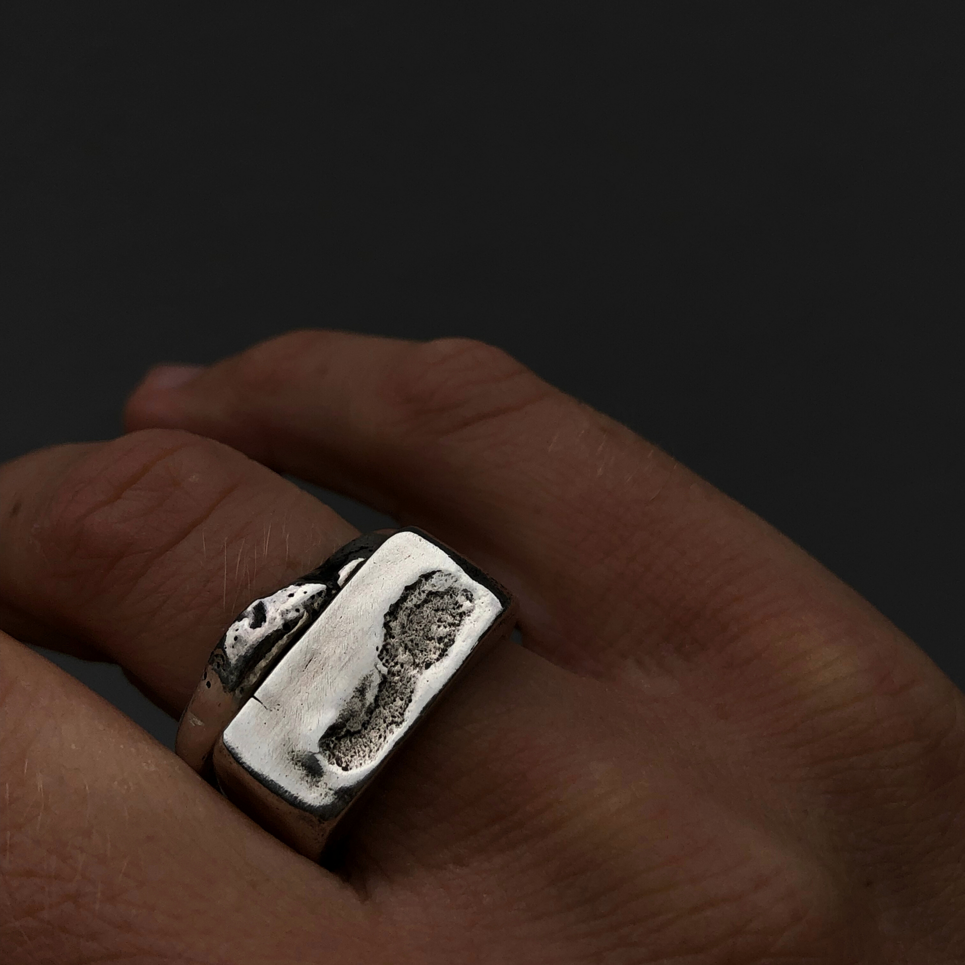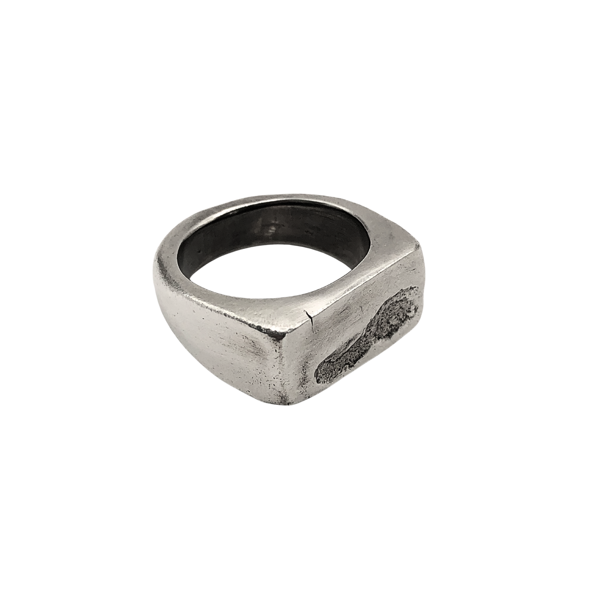Masonry is a special edition in 940 Silver and a study in structure and decay. This ring reimagines the classic brick as a vessel of tension and tactility. With its rough-hewn surface and uneven square form, it channels the quiet drama of erosion.
